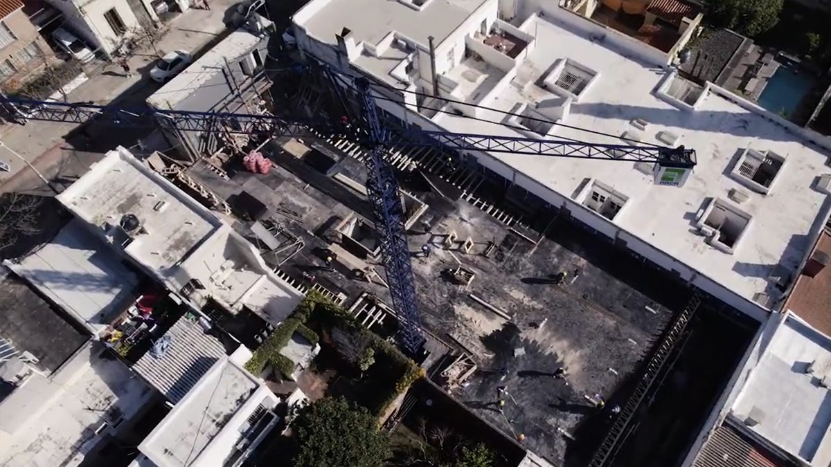 La losa de planta baja y la del primer piso ya se encuentran completamente finalizadas. La obra continúa avanzando a buen ritmo con la ejecución de la estructura, en paralelo con la instalación eléctrica interior. Además, se realizó el llenado de las primeras columnas de hormigón rosado, que darán forma a la distintiva fachada del edificio.